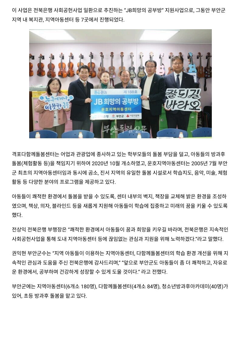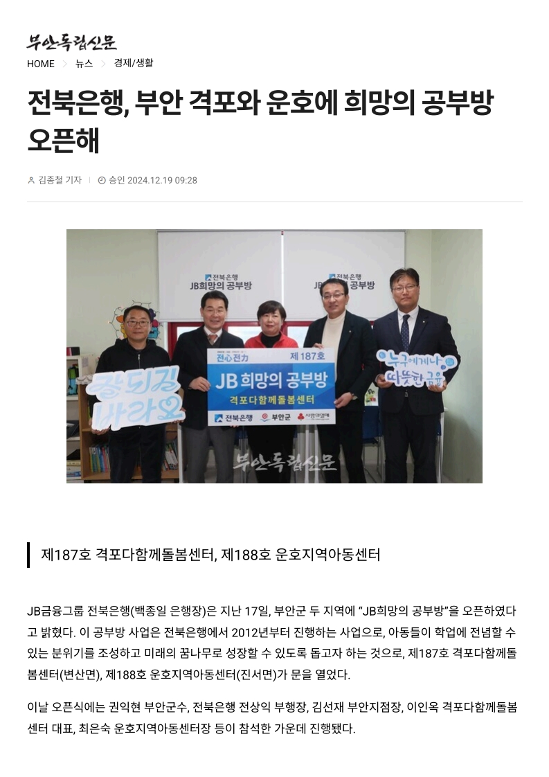전북은행, 부안 격포와 운호에 희망의 공부방 오픈해