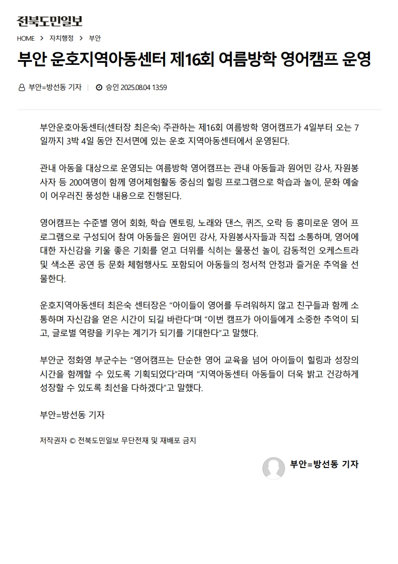 부안 운호지역아동센터 제 16회 여름방학 영어캠프 운영